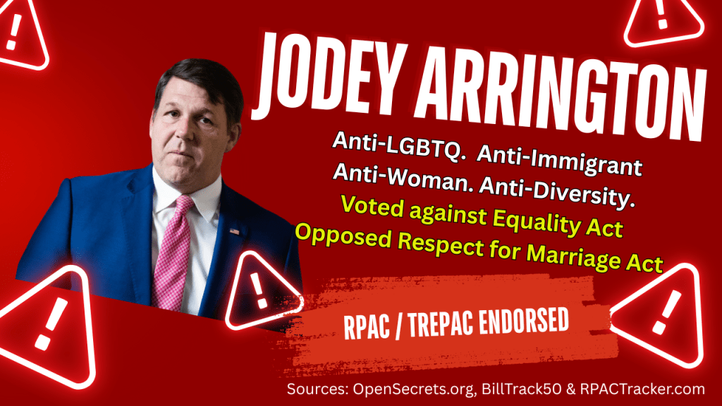 - In 2025, Arrington championed the amendment to the “Big Beautiful Bill” (a budget and reconciliation package), effectively removing Medicaid, CHIP, and ACA coverage for gender-affirming care. He framed it as medical intervention “cutting off transgender surgeries for minors.”