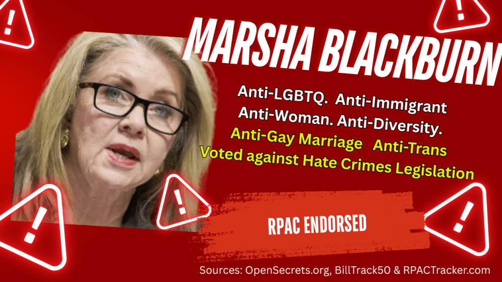 Senator Blackburn’s record demonstrates a consistent pattern: from anti-LGBTQ legislation and rhetoric, to stances supporting aggressive immigration enforcement, and efforts to eradicate institutional DEI.