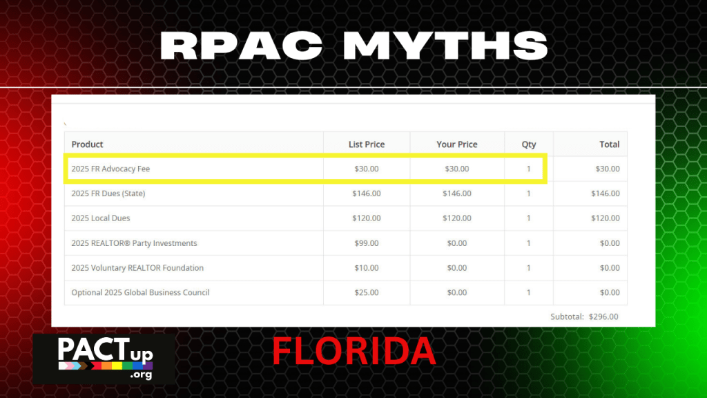 FACT: PAC donations must be voluntary. Forcing REALTORS® to “donate” as punishment violates federal law, RPAC’s own guidelines, and our Code of Ethics.