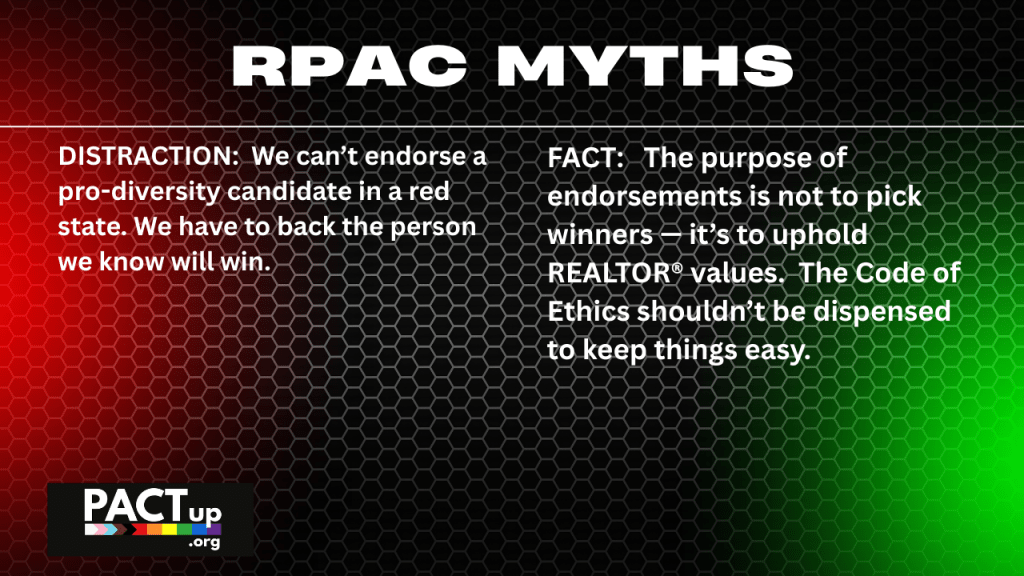The REALTOR® Code of Ethics — specifically Article 10 — requires us to oppose discrimination in all forms. That obligation doesn’t vanish in a red state or a blue one. When RPAC endorses anti-diversity candidates under the excuse of electability, it communicates that winning matters more than integrity. It tells marginalized communities that their rights are negotiable.