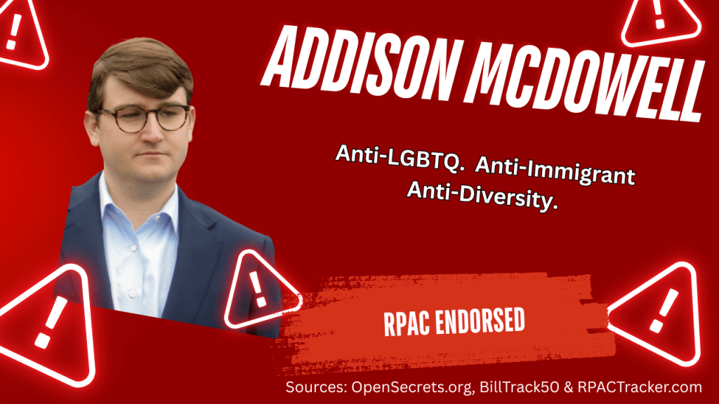 Rep. Addison McDowell has built his short congressional career around pushing legislation that directly undermines LGBTQ rights, immigrant families, and diversity initiatives. His actions not only stigmatize vulnerable populations—they also weaken the economy and community fabric of North Carolina.
